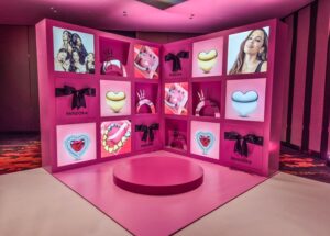 – A 120sqm showroom with padded pink velvet walls, custom displays, and decor reflecting Pandora’s identity.