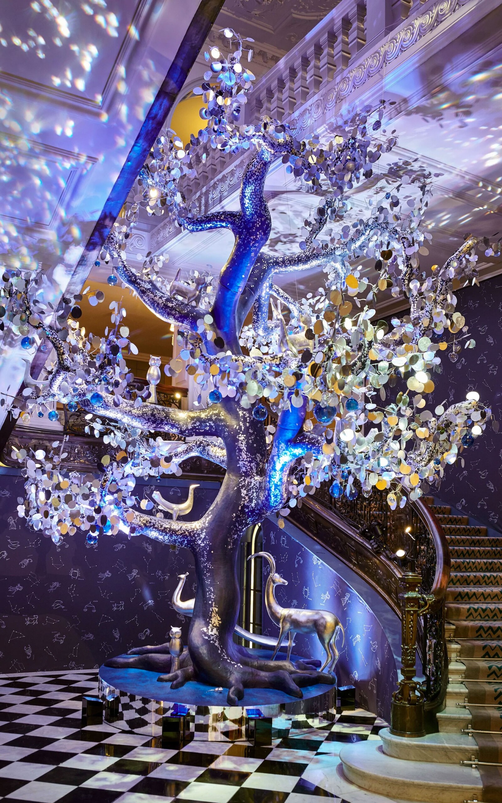 每年,著名的Claridge’s酒店都会邀请时尚界的领军人物来设计其圣诞节中心,以拉开这欢快季节的序曲。 Diane von Furstenberg是酒店的长期顾客与朋友,她很高兴地承接这份荣耀使命,设想坐落在酒店大堂里的圣诞树。 受到她有关爱的力量这一信仰的启发,“爱之树”的概念诠释了“一切都来自于宇宙,树从根部向着天空生长”的理念。这座六米高的雕塑艺术品表面饰有乳白色的微光,配有六种不同的动物图案。值得注意的细节包括8,000片手绘银叶,150个手工吹制半透明玻璃心和一面占星主题墙纸。当Diane von Furstenberg点亮树木时,灯光照射在树叶上,在天花板上投射出璀璨星光的剪影。里维拉从件艺术品中汲取灵感,用于打造令我们的客户和其宾客们深刻印象的活动。有什么灵感正在这个季节激发你的创造力呢?